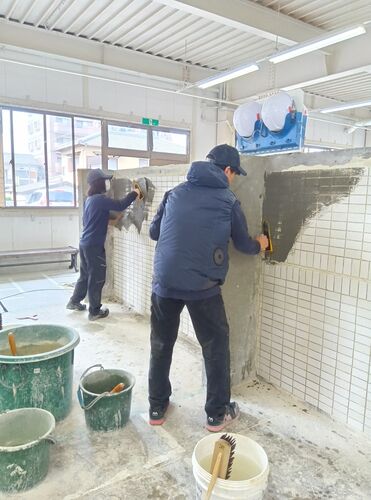前回の投稿では実習台の壁に モザイクタイルを張る訓練風景をお届けしました。 今回はその壁に張ったモザイクタイルに目地を詰める様子と 実習台の出隅を使ったタイル張りの訓練の様子をお届けします。 まずは目地を詰める訓練です。 硬い目地に四苦八苦しな…
